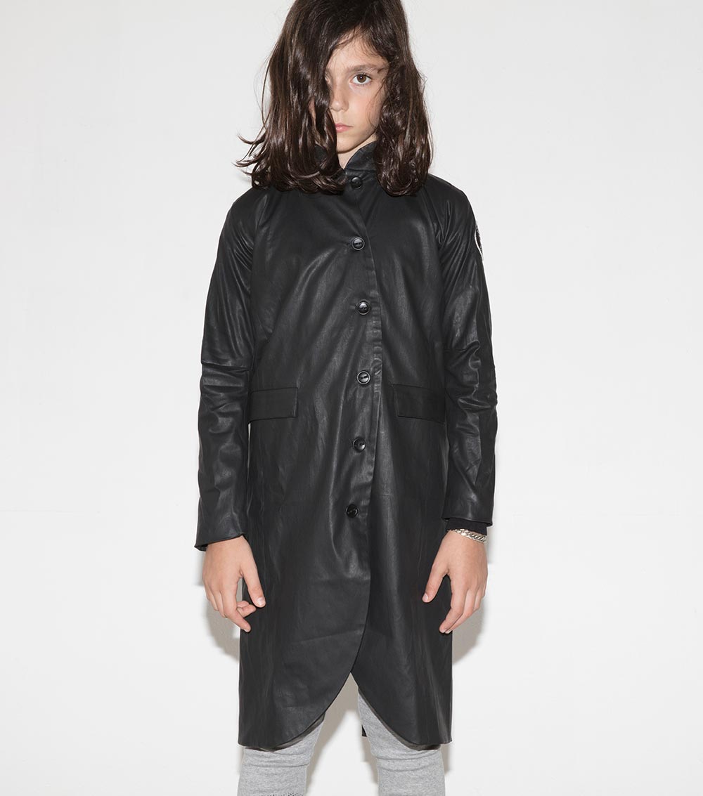 is it crazy to think that, if you dress a kid in military garb, he or she will follow marching orders, no question? probably, but still. the military-inspired coat is forever the height of fashion, with its ¾ length & cutaway button front. waxed for protection & slick vibes, it’s the rebel civilian’s version of a classic serviceman style, complete with flap pockets & the nununu logo patch on the arm.