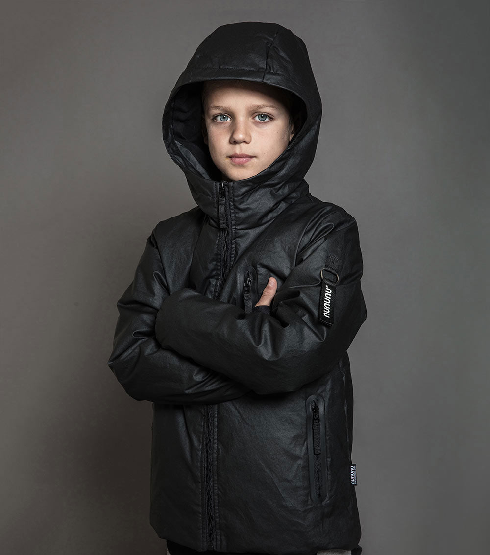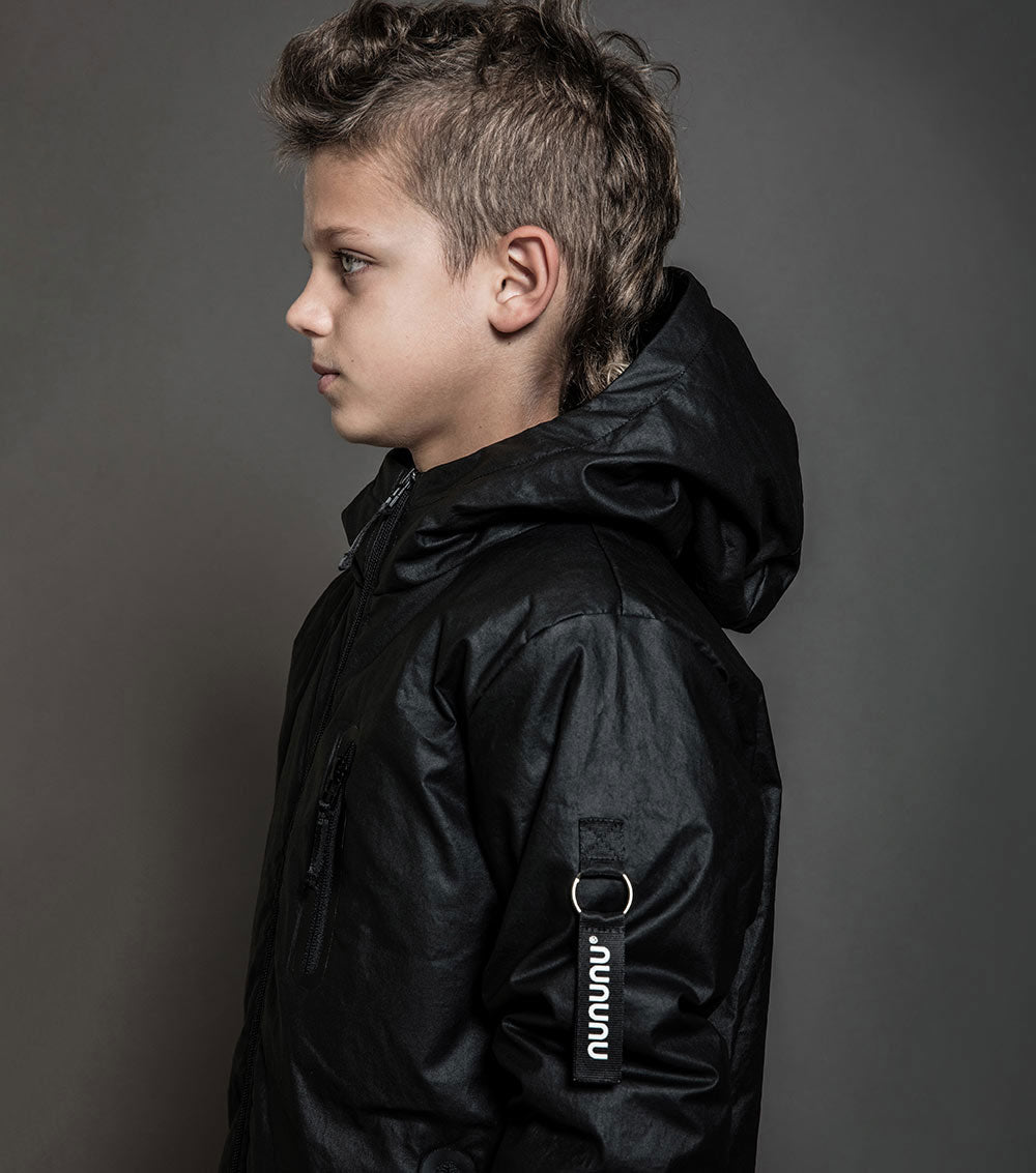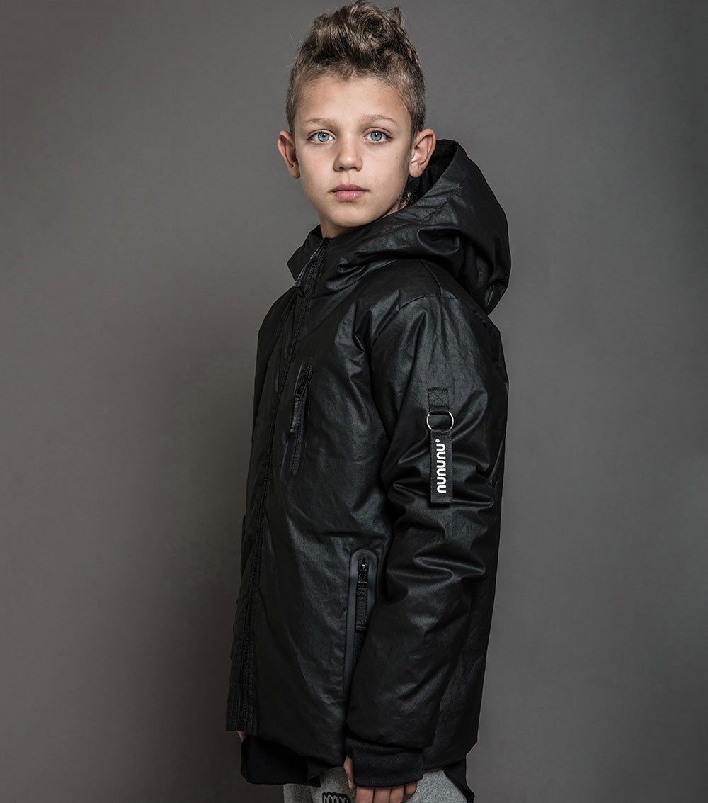 for winter, the style game is all about outerwear. get a good black jacket and everything else falls into place. this ultra-cool, functional down jacket is the basic boys & girls need for the sartorial win. waxed for water resistance and high-style sheen, it’s got clean lines & a minimalist feel. the big luxe hood goes up & zips through the neck, insulating the kid against the cold & nasty wind. zip pockets keep candy & other contraband securely stowed.