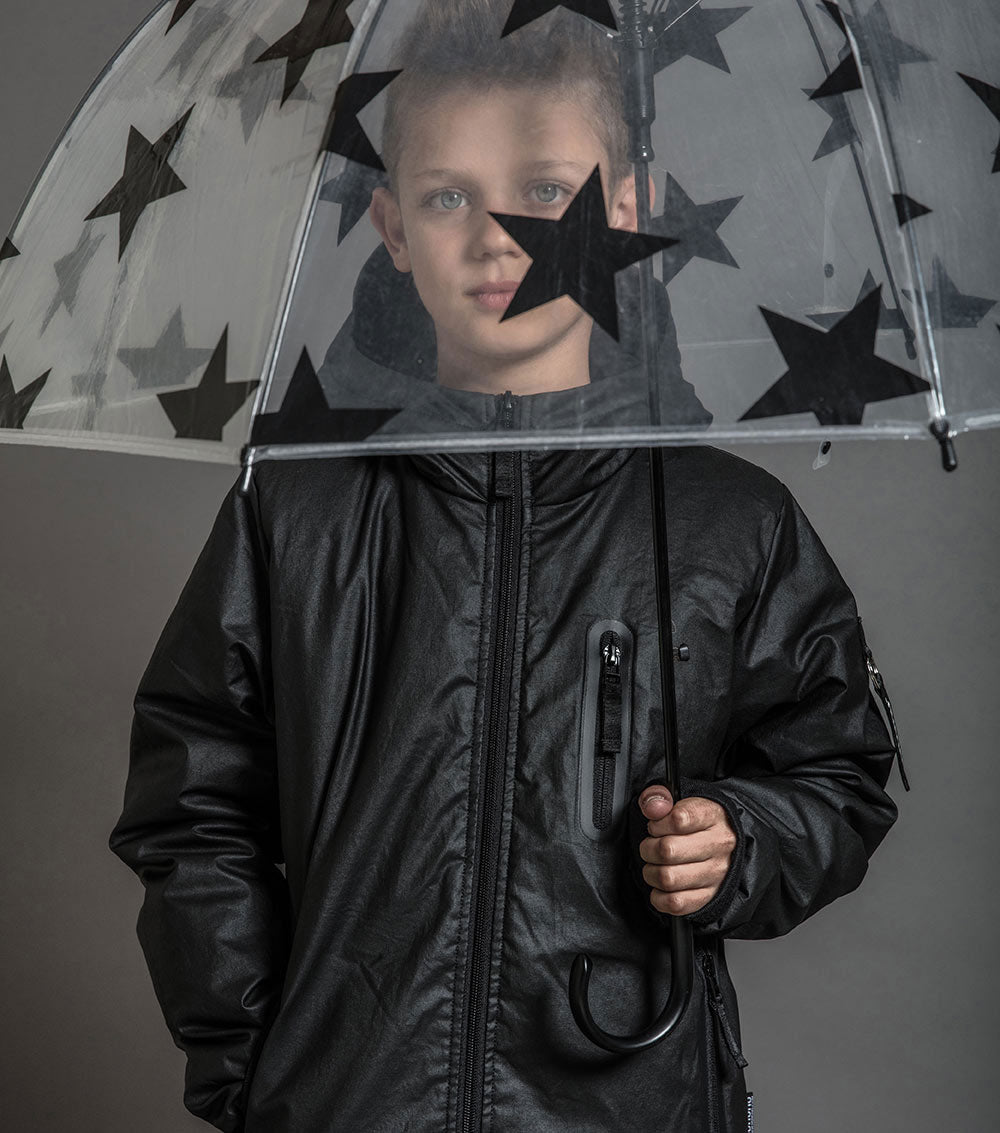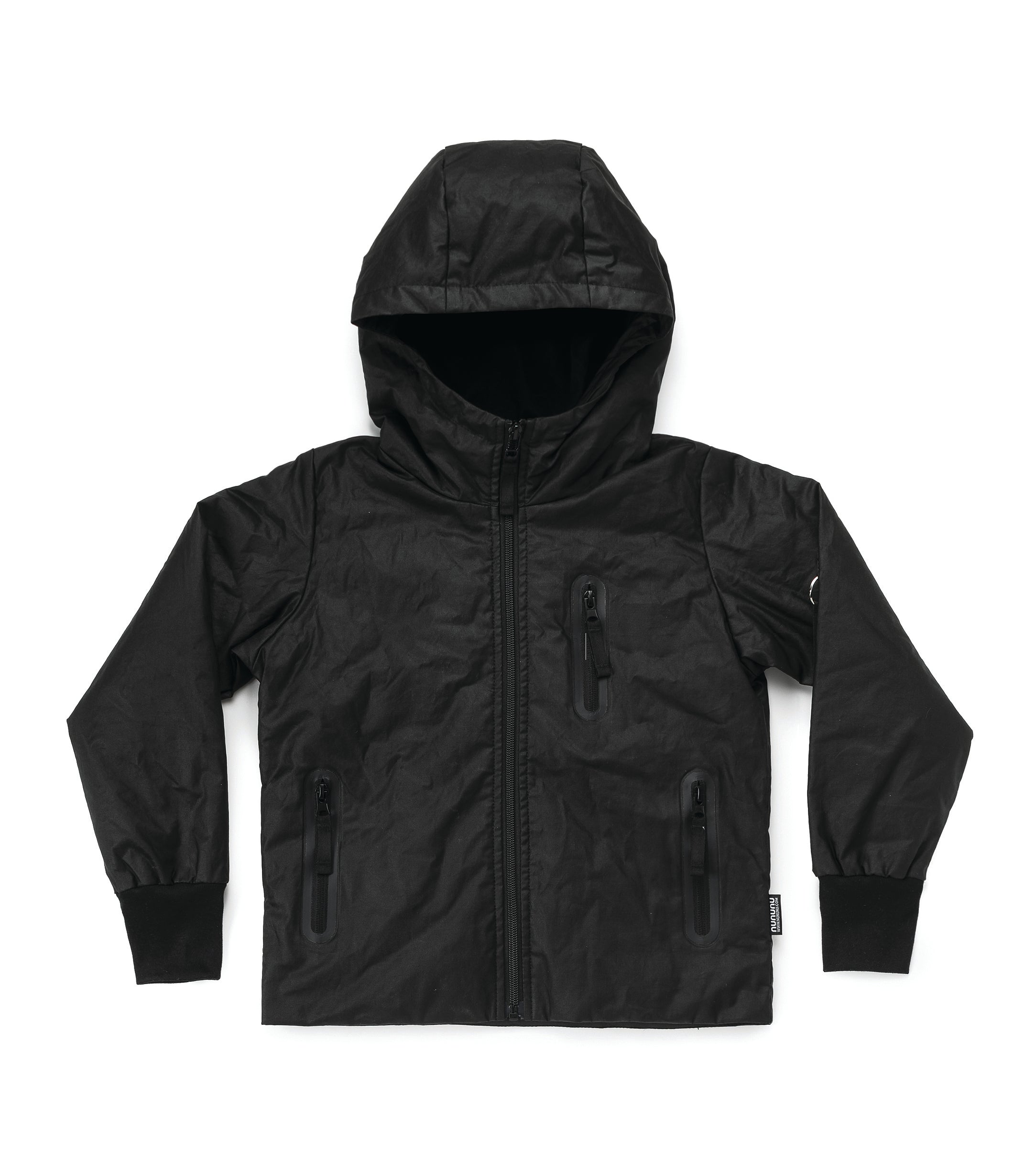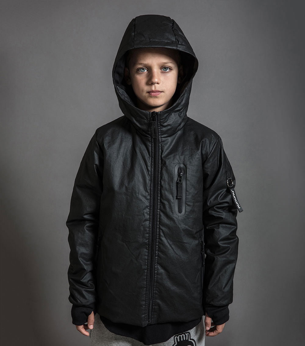 for winter, the style game is all about outerwear. get a good black jacket and everything else falls into place. this ultra-cool, functional down jacket is the basic boys & girls need for the sartorial win. waxed for water resistance and high-style sheen, it’s got clean lines & a minimalist feel. the big luxe hood goes up & zips through the neck, insulating the kid against the cold & nasty wind. zip pockets keep candy & other contraband securely stowed.