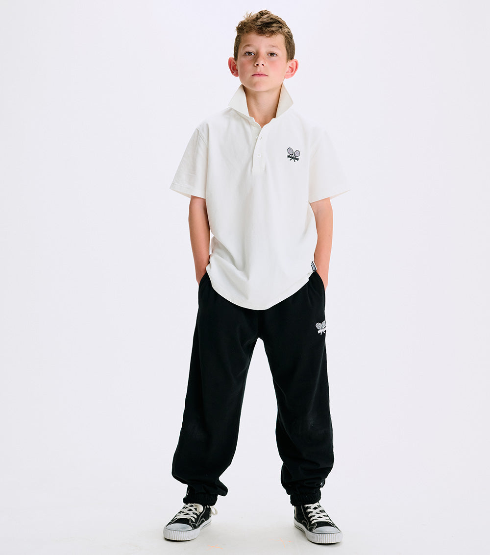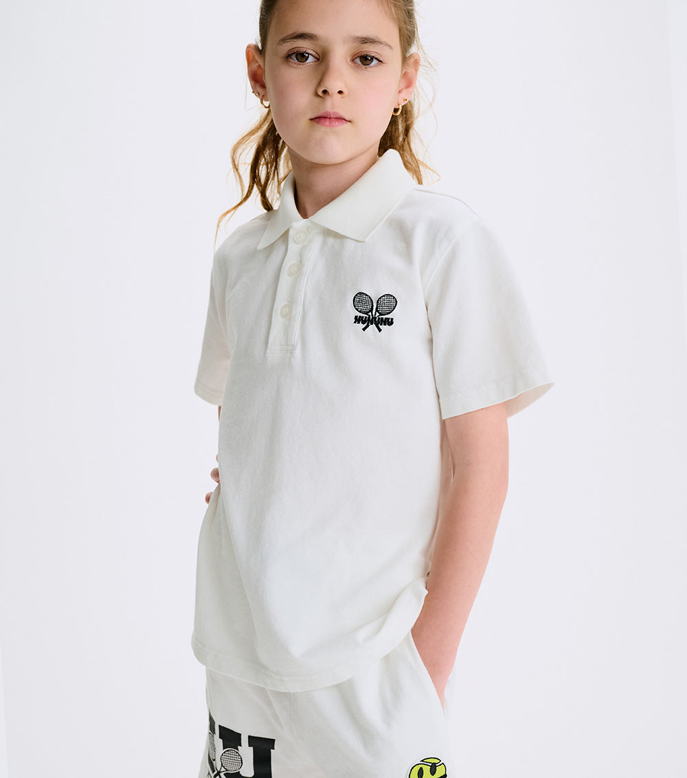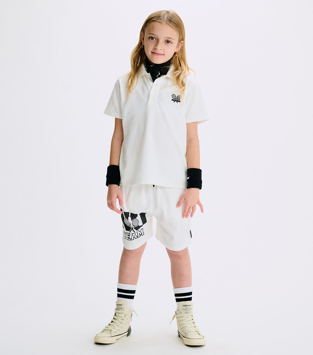 need a look that screams country club connoisseur? this is it. it’s a polo shirt made of white cotton pique so it’s extremely soft, flexible & cozy for all day play. even better, we've ditched the usual polo cut in favor of a t-shirt kind of vibe on the inner body but kept it classic with a soft rib collar, three tone-to-tone buttons, and clean edges. to top off this epic fit, our nununu dueling tennis rackets logo is embroidered in black on the chest, hinting at an impending challenge.