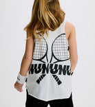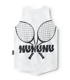 when the sun & the serves are both coming in hot, you’ll be glad you’ve got this breezy white tennis tank. it's an athletic cut made out of soft heavy single cotton that moves & breathes with you. we kept it business in the front with the sliced nununu logo & a clean collar but in the back it's a total party. the sleeves are cut wide & round almost like a racerback, taking a chunk out of our super cool dueling tennis racket print on the back, split by a center seam. hemlines on the bottom & sleeves are raw & rolling kind of like the ball away from your opponents after every ace.
