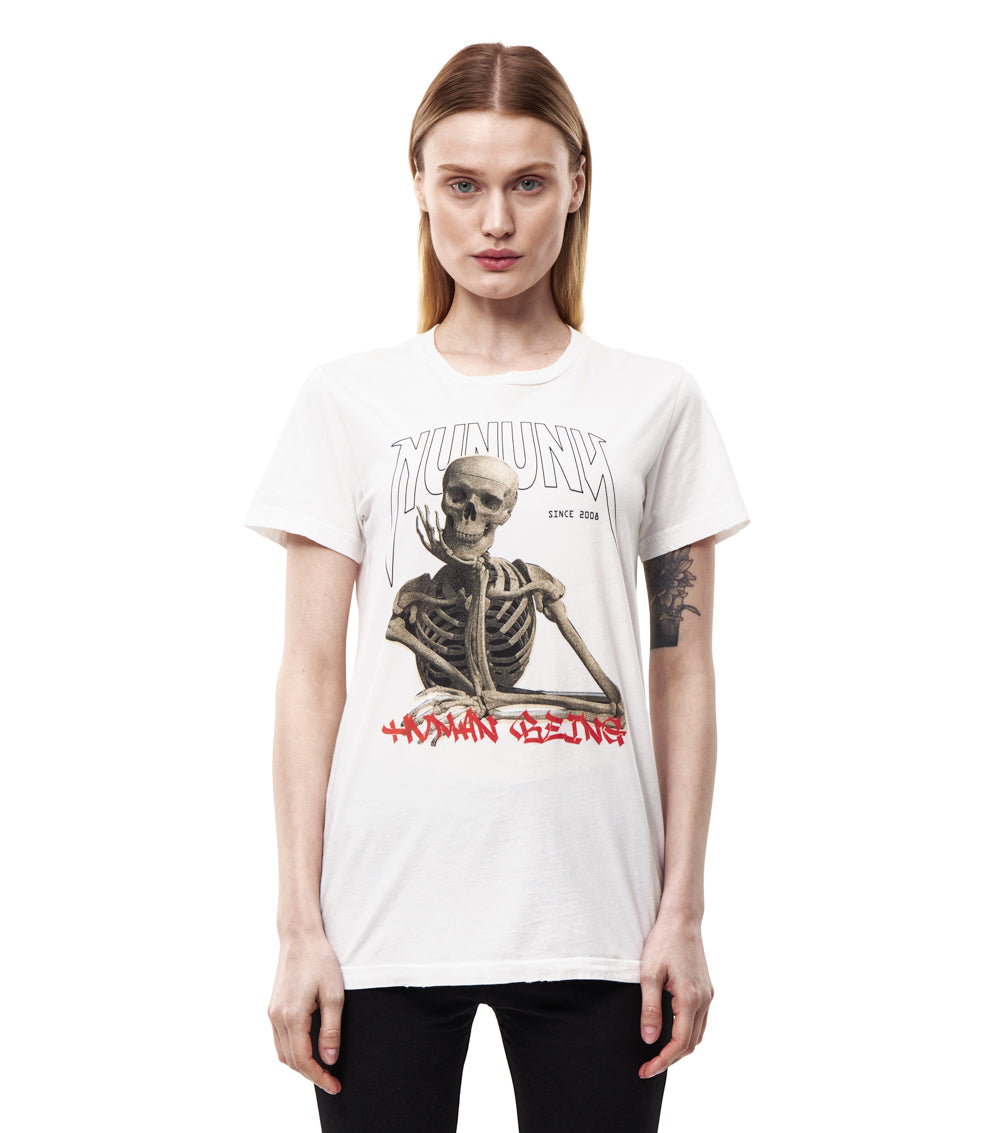 not sure you noticed how we named this white t-shirt, the "patience t-shirt". notice the way this cool skull is sitting? as if it's waiting for something... just like we all feel sometimes when we're waiting for anything. our rawk style logo in white reminds you where you're out and the "human being" print? basically is what we are all afterall!