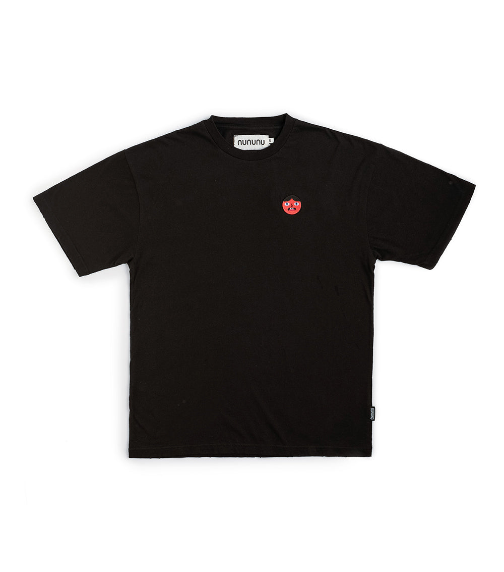 there is nothing like the effortless perfection of a nununu t-shirt. that cut, that softness, a little bit of raw edges all around. this one has all that plus a minimal red chest patch with a quarky/shocked character from british artist Craigio Hopson. a pop of fun for your favourite black tee. our embroidered tiny skull floats near the hem in back. this one comes in men’s sizes too.