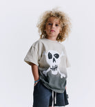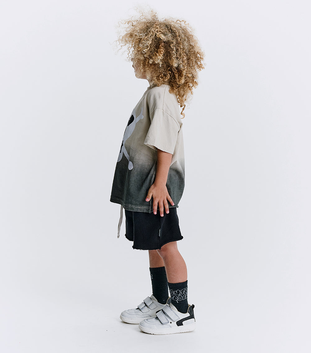 this tee will make your kid feel sick in the best kind of way. it’s made of smokey natural heavy single cotton that turns to dark grey like it’s been dipped in a bucket of color. We’ve added the woozy skull print that almost looks like it was drawn in pencil by your personal rebel. of course, custom deconstruction keeps the edge factor where it should be. at an all time high.
